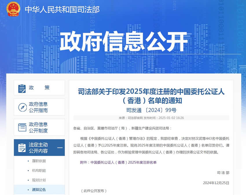 司法部關于印發(fā)2025年度注冊的中國委托公證人(香港)名單的通知